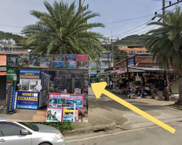 3. Notice green ATM & blue money exchange kiosk. Turn left.